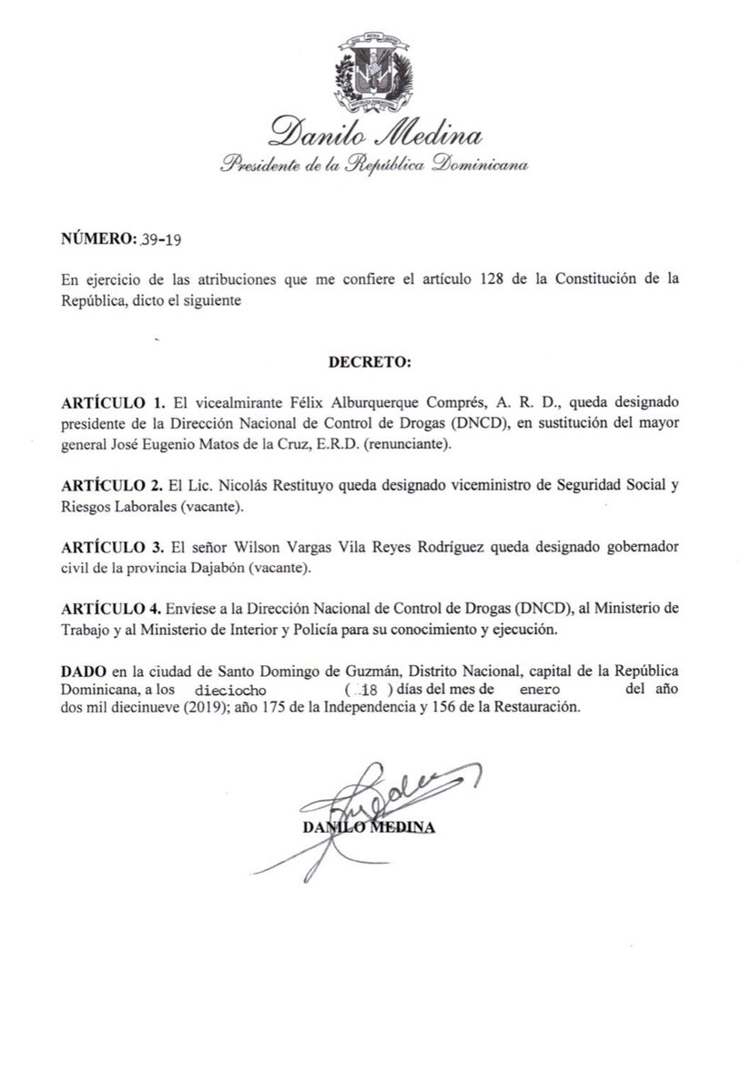 La sustitución de Matos de la Cruz de la agencia antinarcótica se produce tras el escándalo por el asesinado a tiros, en un punto de drogas en Baní, del coronel de la Policía Nacional Daniel Ramos Álvarez.Mediante el decreto 39-19, emitido este viernes, el presidente Medina también designó al licenciado Nicolás Restituyo como viceministro de Seguridad Social y Riesgos Laborales, puesto que estaba vacante.
